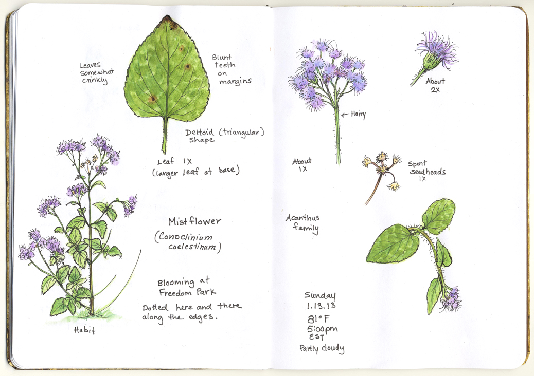 As you can see from my notes on both sketches, mistflower blooms in